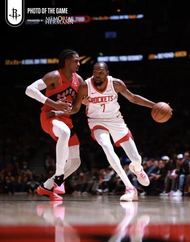 “杜兰特和小史密斯合砍56分,对阵猛龙”,火箭官媒附文道。